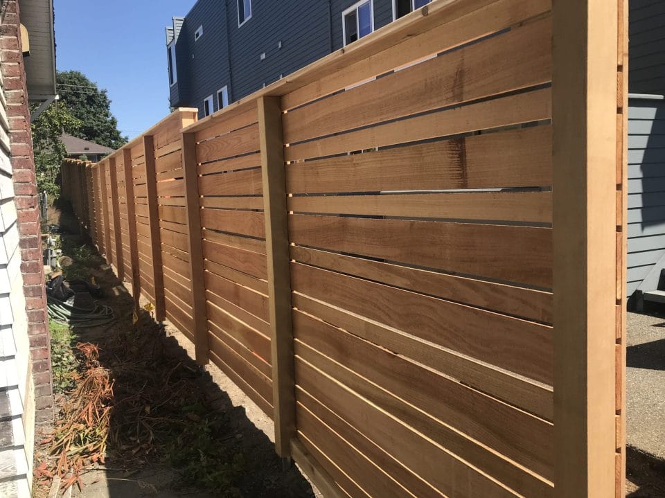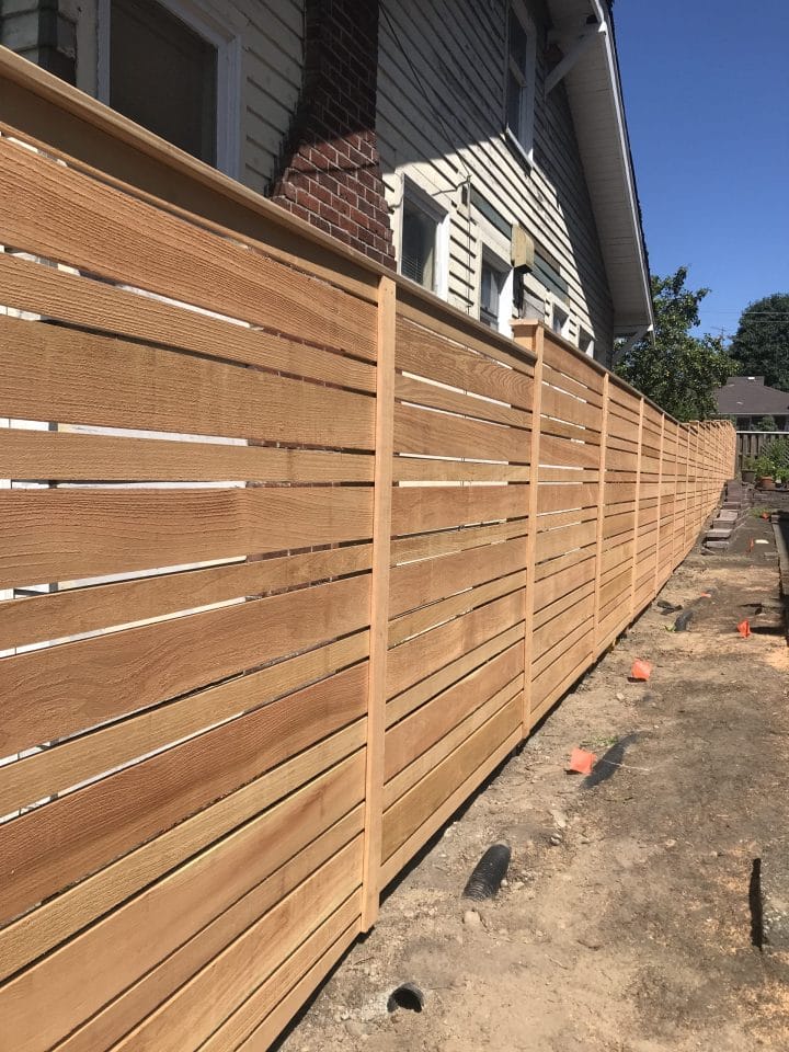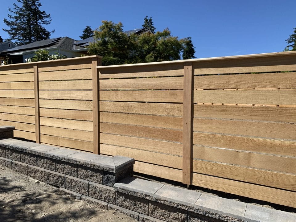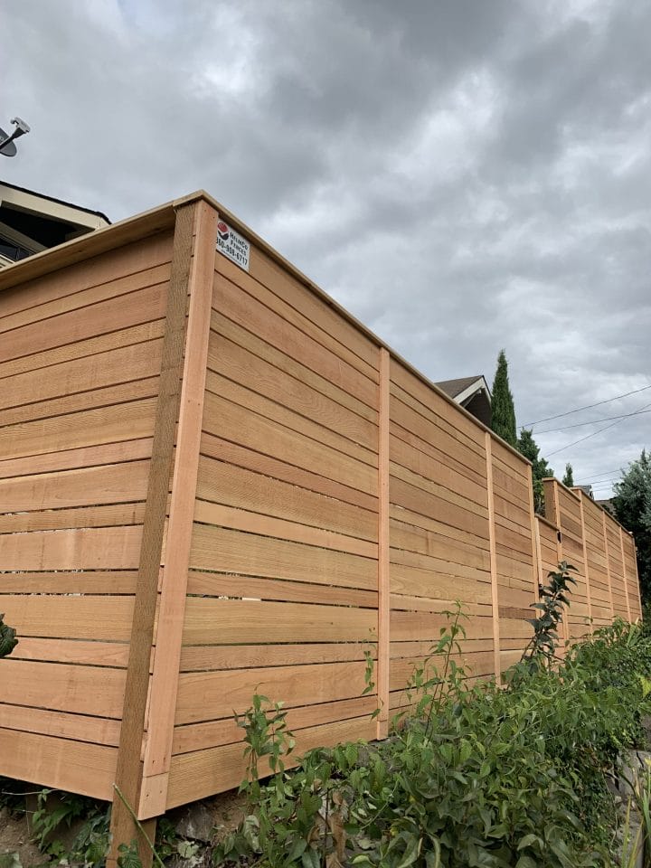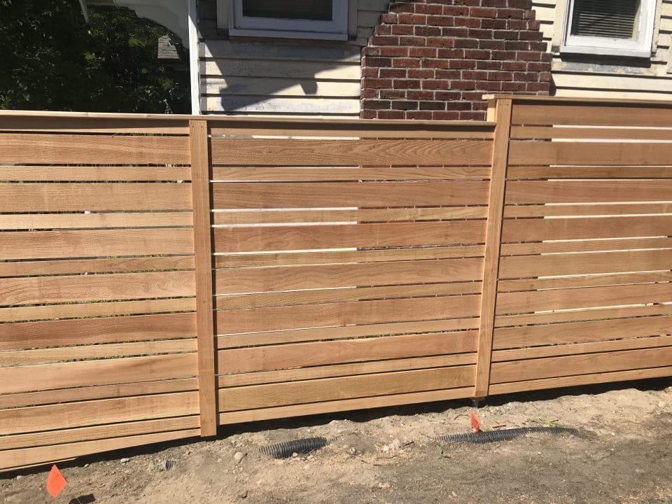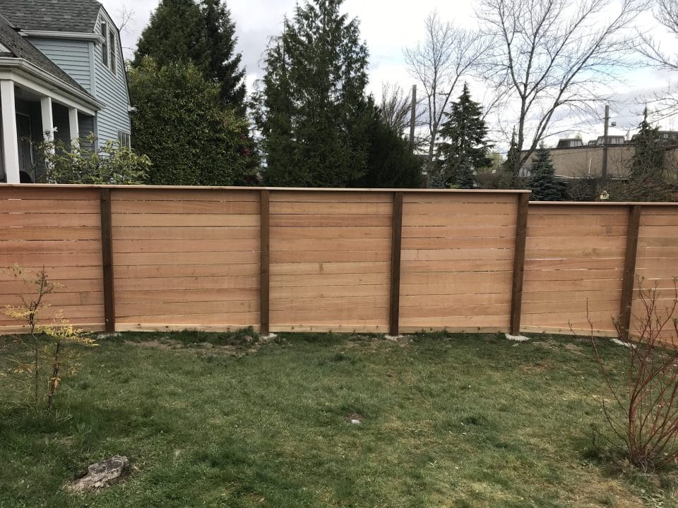 The modern style fence is built with the cedar fences boards running horizontal. The posts are cedar pipe on post and galvanized fasteners. In this modern fence, we used clear cedar which is an optional upgrade.