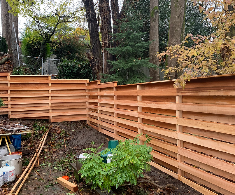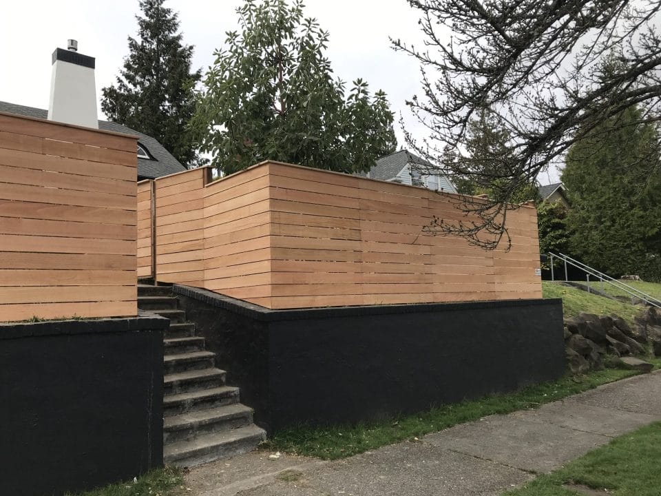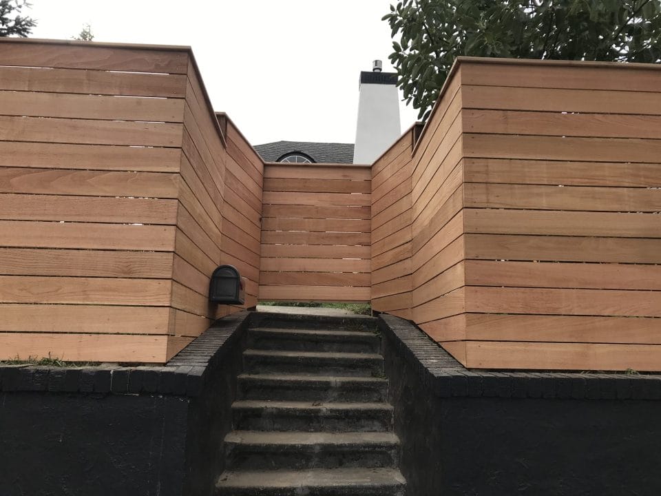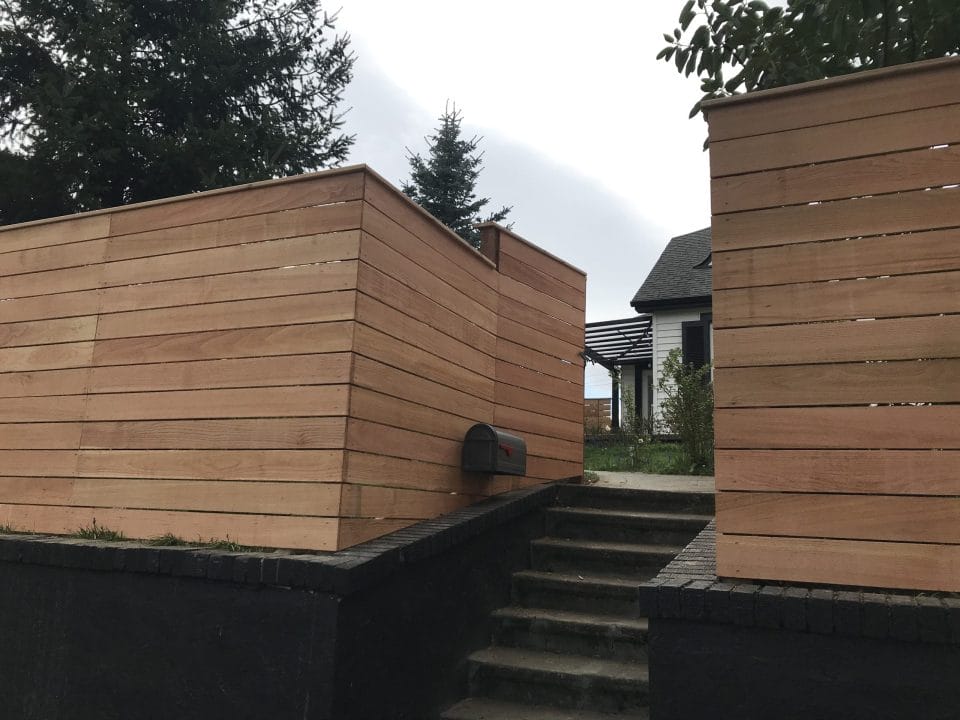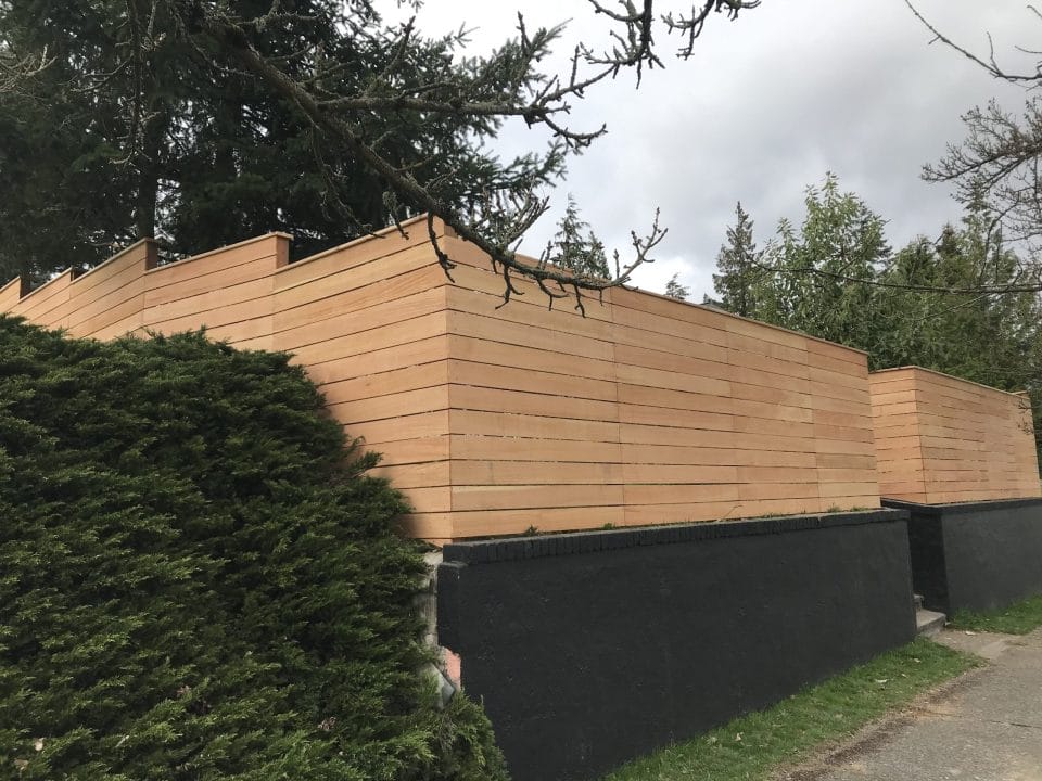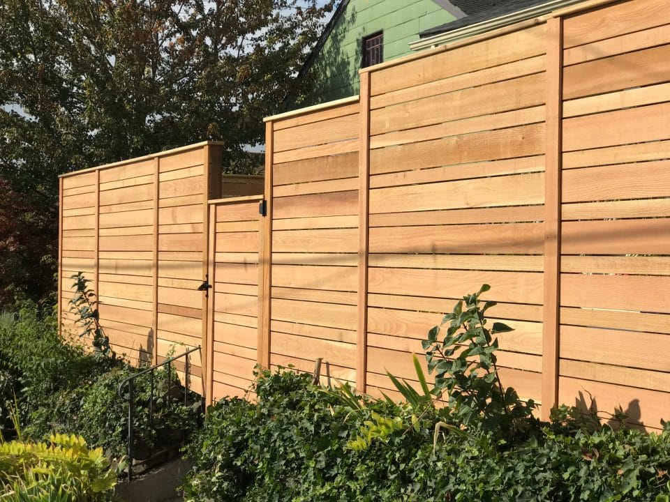 The modern style fence is built with the cedar fences boards running horizontal. The posts are cedar pipe on post and galvanized fasteners. In this modern fence, we used clear cedar which is an optional upgrade.
